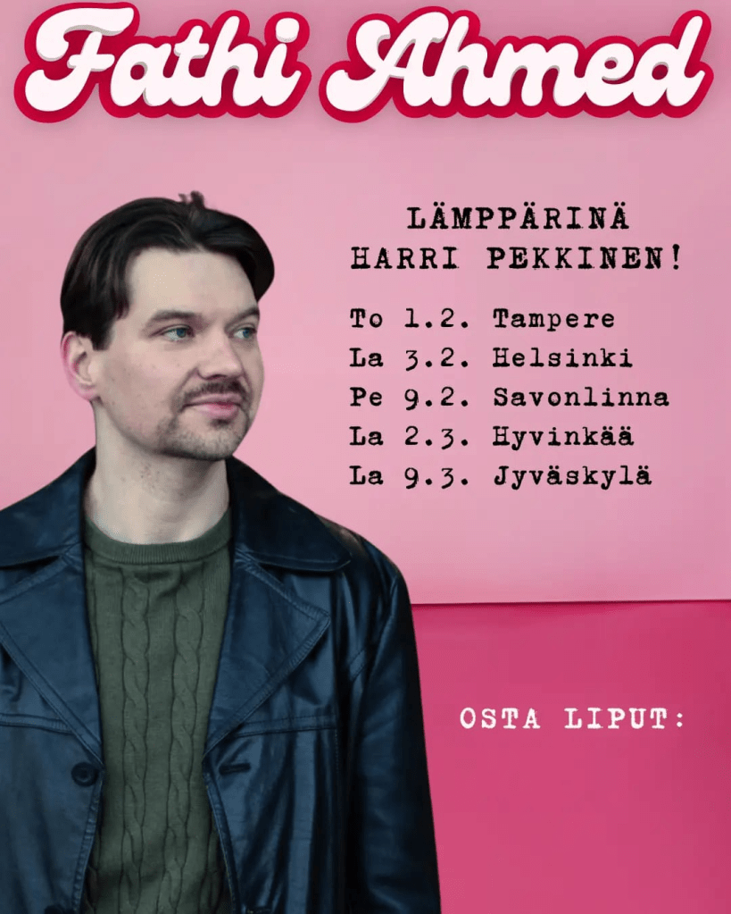 Fathi Ahmedin soolokiertueesta Sisäkkö, kokki, TV- tähti oli eilen Helsingissä kiertueen kolmas veto Teatteri Avoimien Ovien tiloissa. Eilisellä keikalla oli myös Harri Pekkinen lämppäämässä Fathia.