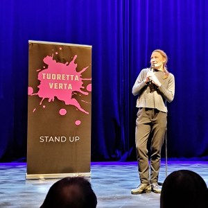 Illan viimeisenä lavalle saapui Tiina Henkola, jota selkeästi moni yleisöstä oli tullut kuulemaan. Stand upissa hienointa on se, että sen tekijät pääasiallisesti ammentavat lavalle juttuja omasta elämänpiiristään ja persoonastaan. Meillä on yhteiskunnassa aika vähän yli 50-vuotiaiden naisten ääniä ylipäätään, saati sitten seniorikansalaisten. Vaikka Tiinan hahmo on monin tavoin toimelias ja vähän roisi, huumori pelaa enemmän senioreihin kohdistetuilla ennakkoluuloilla kuin muulla. Yleisö otti Tiinan vastaan lämpimästi ja lähes kaikki punchlinet saivat ryhmänaurut. Taitavaa tekemistä, joka selkeästi puri ystävänpäivän yleisöönkin.